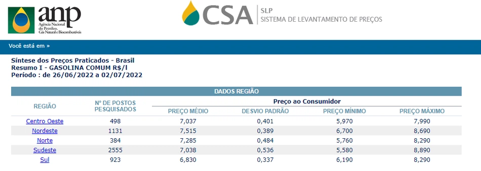 Segundo dados da ANP, a região nordeste é a região com os valores mais caros em combustíveis, com uma média de preço de R$ 7,515, seguido pela região Norte com R$ 7,285, Sudeste com R$ 7,038, Centro Oeste com R$ 7,037 e Sul com 6,830.